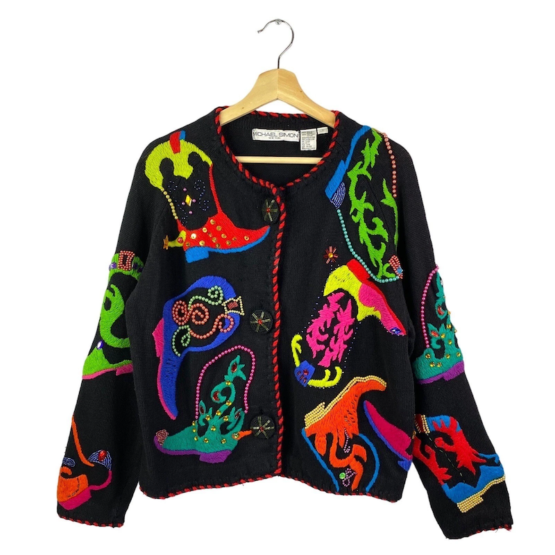 Look at this tasteful cowboy boot cardigan. A practical addition to any wardrobe. I can't decide if I like the black one better or this insane checkerboard monstrosity: