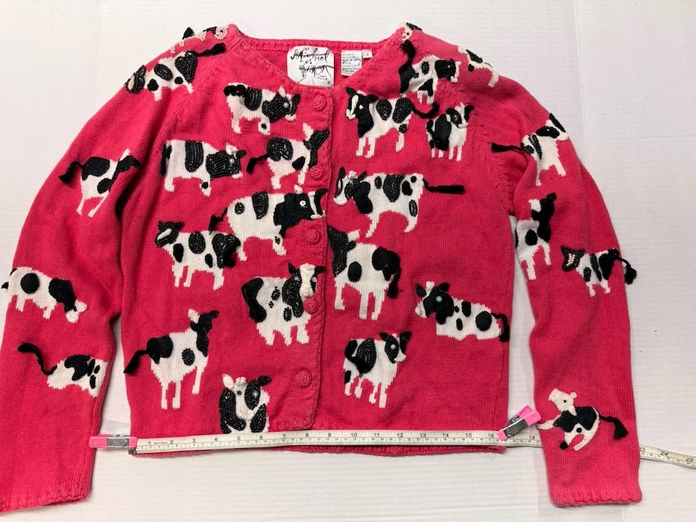 One last sweater on the cow theme. I came across this cattle brand (!?!?!) cardigan. I’m not into… ranching? But I am intrigued by the novelty of it.