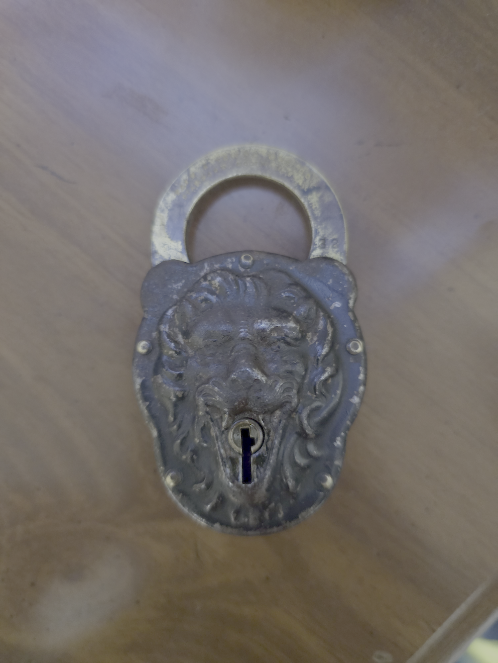 I was totally not expecting a fancy lion padlock. Pretty cool! Unfortunately, I'm told that the key didn't open the padlock, perhaps because of some gunk stuck inside. Fingers crossed that they manage to get it open.