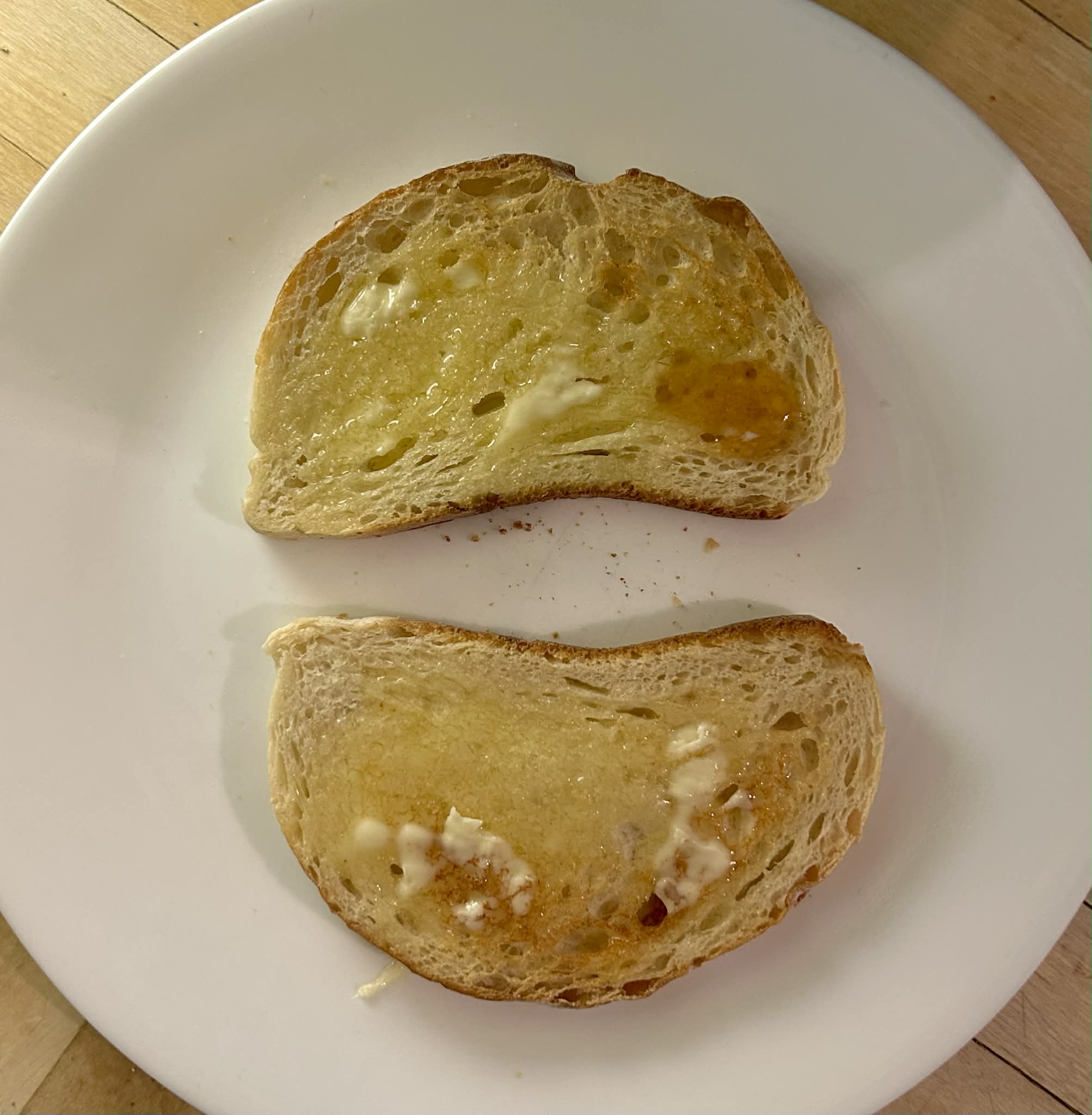 Still, I tried this toast. I knew I wouldn’t like it, so I only added honey to the corner of one slice. Ugh.