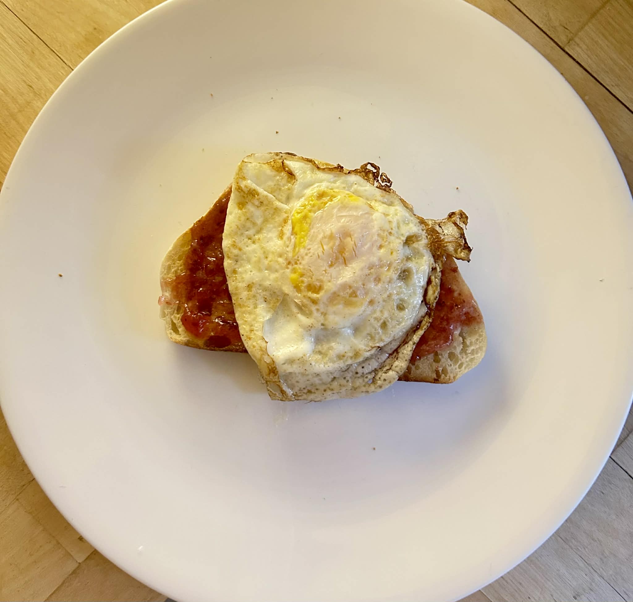 I did a search and was surprised to find some people on Reddit singing the praises of jelly egg toast. So I did begrudgingly try it, substituting raspberry jam and an over easy egg.