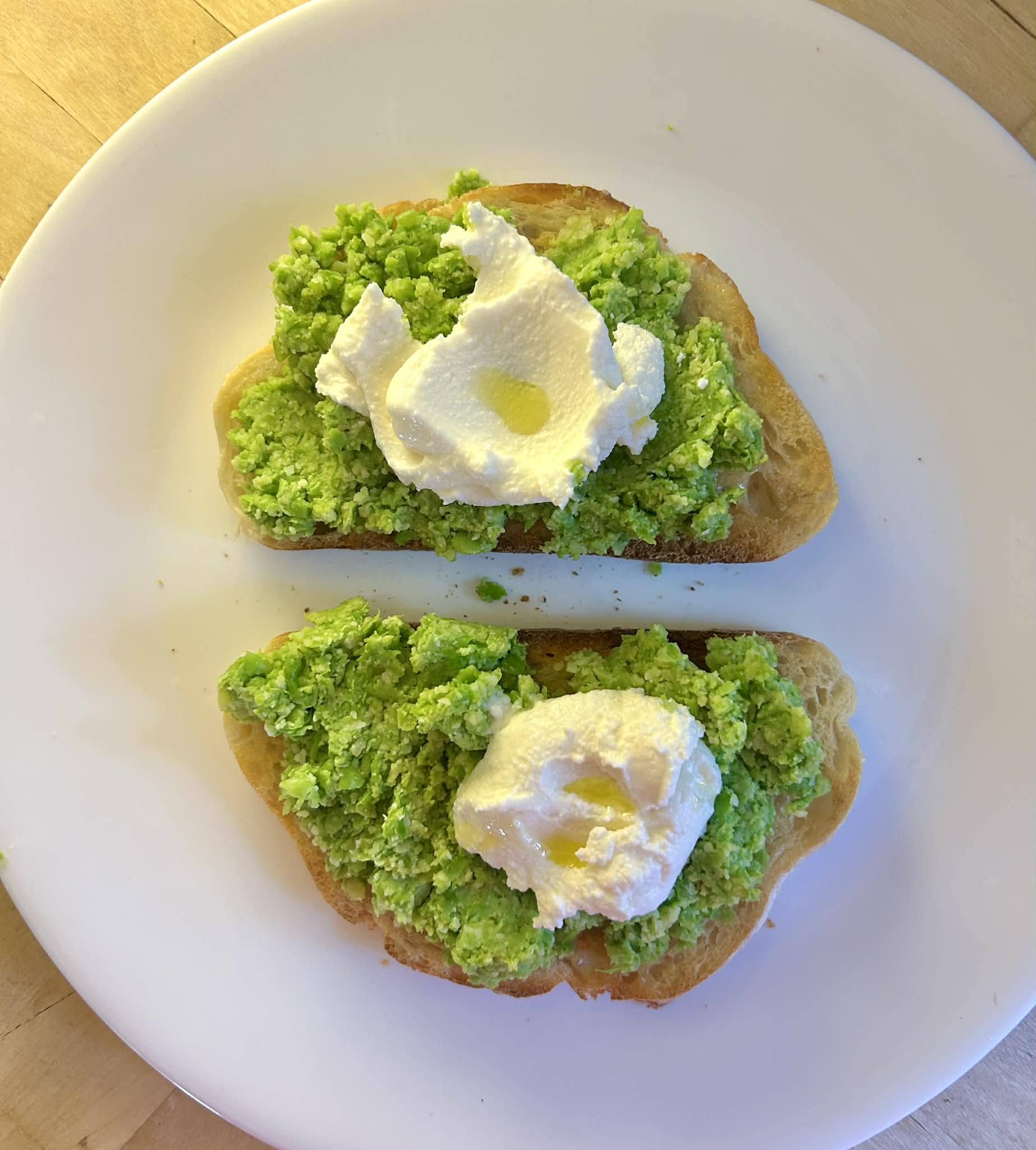 Mash up (I use a food processor) some peas with parmesan, olive oil, garlic, maybe a little basil. Add to toast. Top with ricotta. Consume.