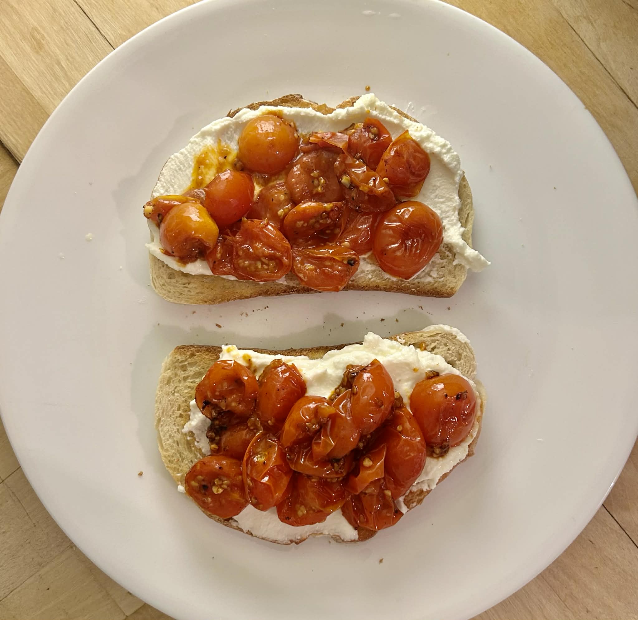Toast topped with ricotta cheese and sauteed cherry tomatoes with garlic. This is my favorite toast.